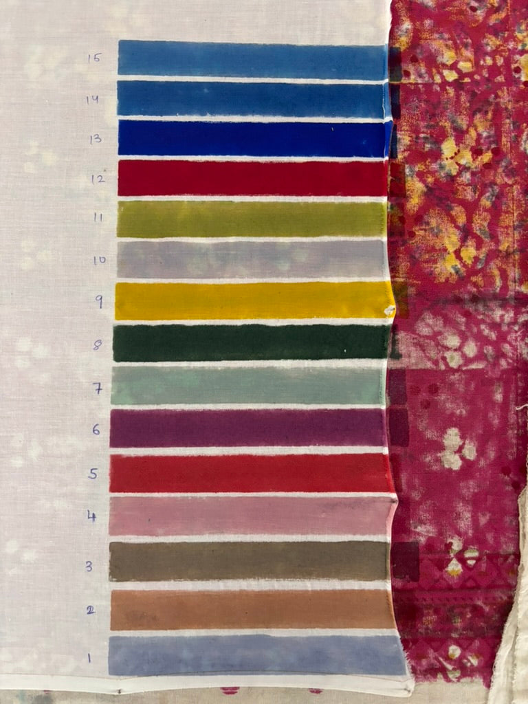 Then, the block dipped in dye, pressed with the rhythm of years of practice meets the cloth.